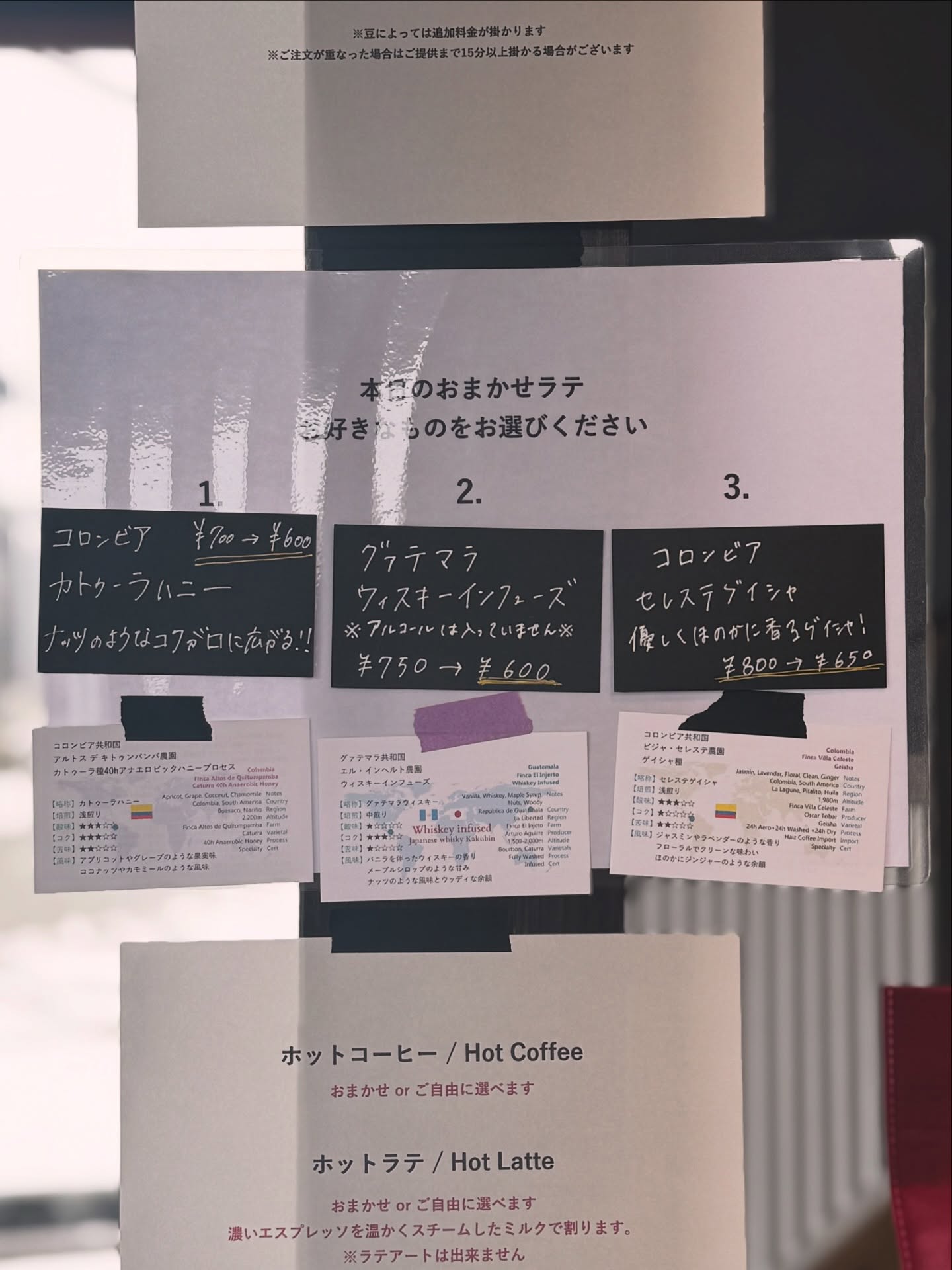 ホットラテ/アイスラテに関しては選びやすいように本日のおまかせ3種を張り出しています
